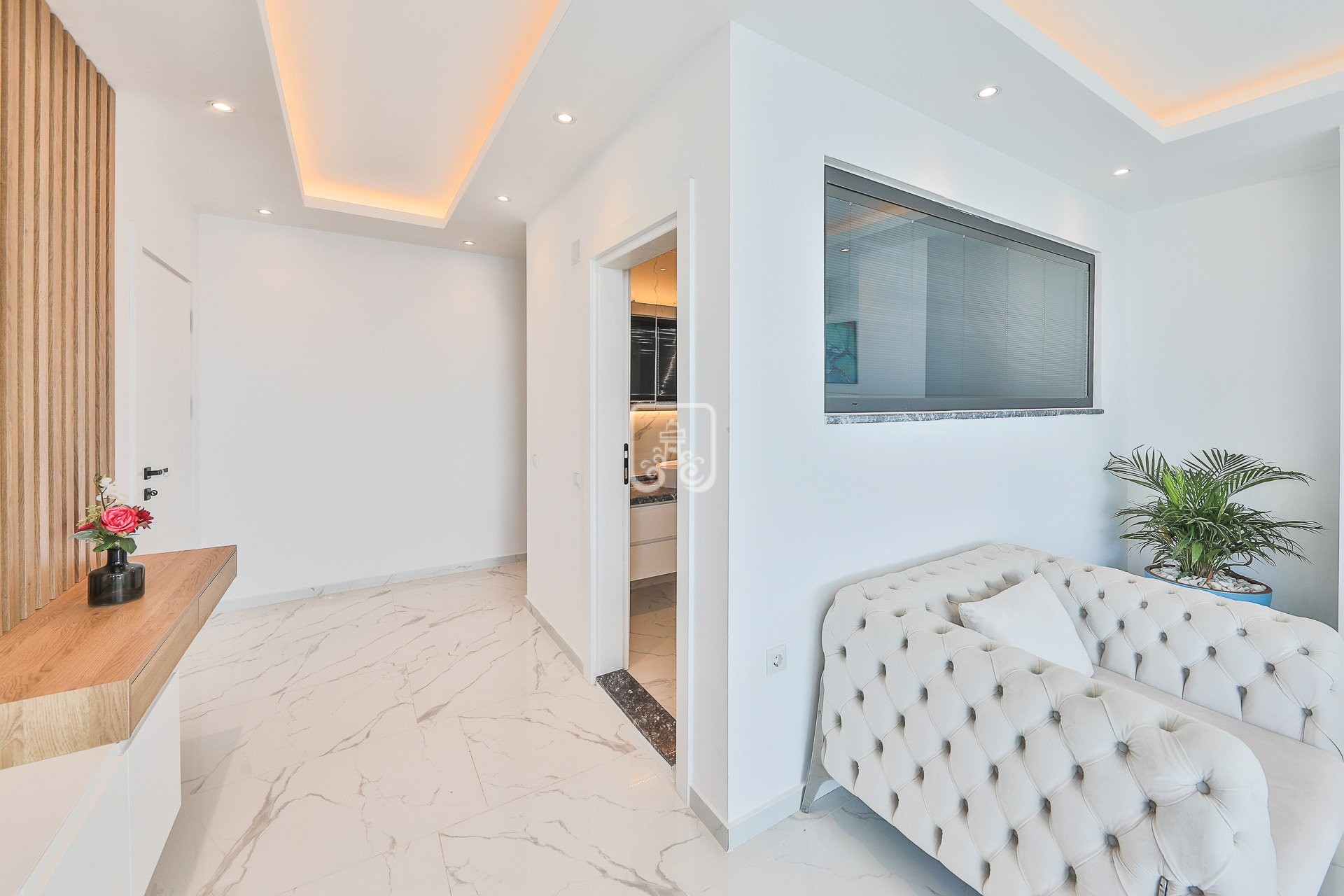 Upon entering the villa, you are greeted with a bright welcoming open plan living room, an open concept fully equipped kitchen and a dining area with doors leading out to the terrace area where you can admire the mesmerising views of Kalkan or take a dip in the saltwater pool.