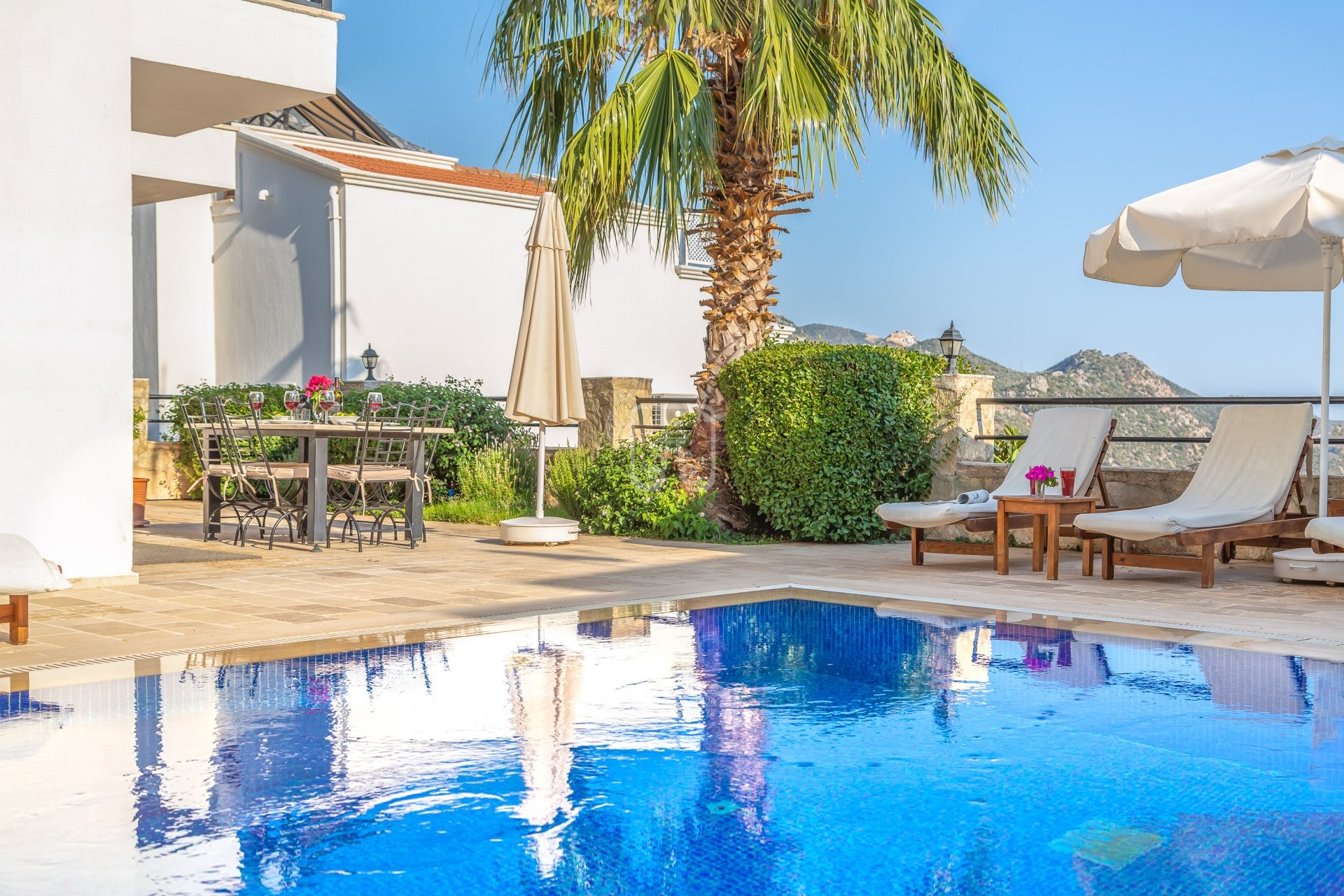 Outside, the pool area is to one side and private from the neighbouring properties. There is a lovely sun terrace around the pool, as well as outdoor dining table and also a shaded Ottoman seating area to relax in.