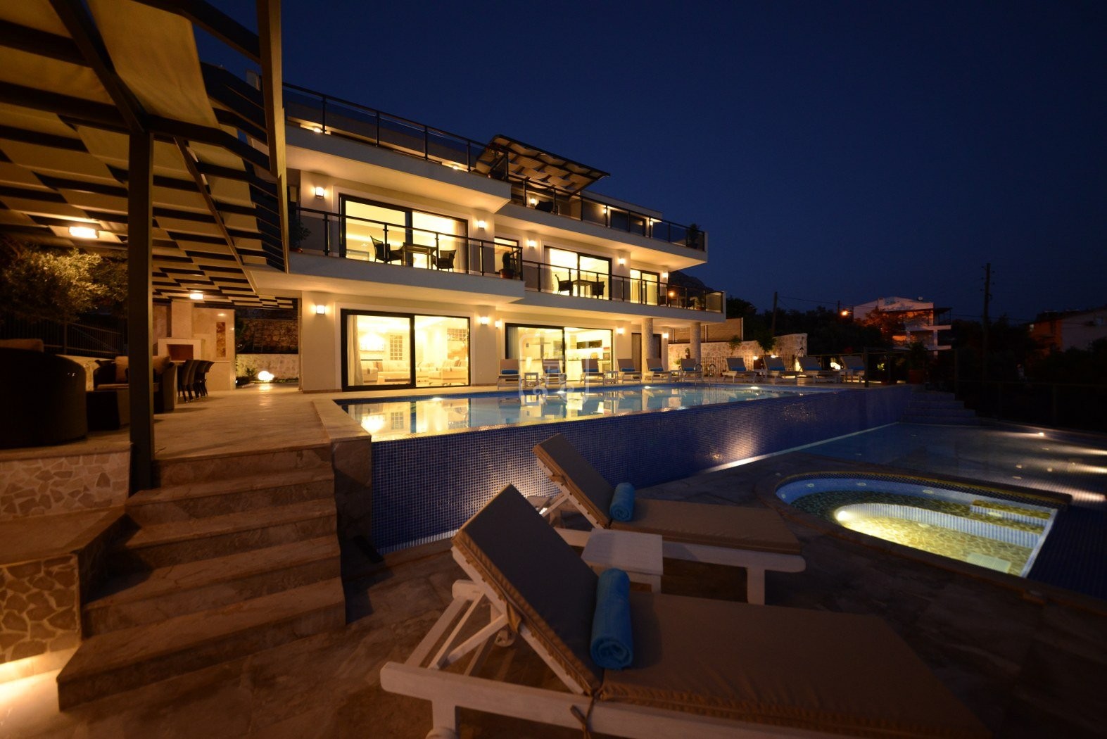 Outside, over a couple of terrace areas are, a private pool, childrens pool, Jacuzzi, sunloungers, parasols, numerous comfortable seating areas and a covered dining area for the great al fresco eating experience, as well as a BBQ and amazing views!