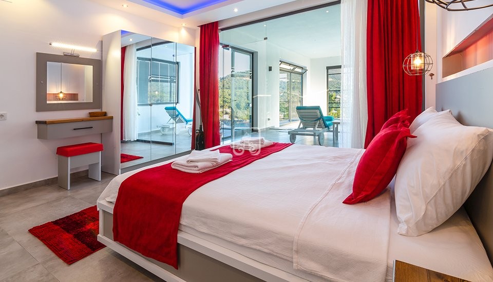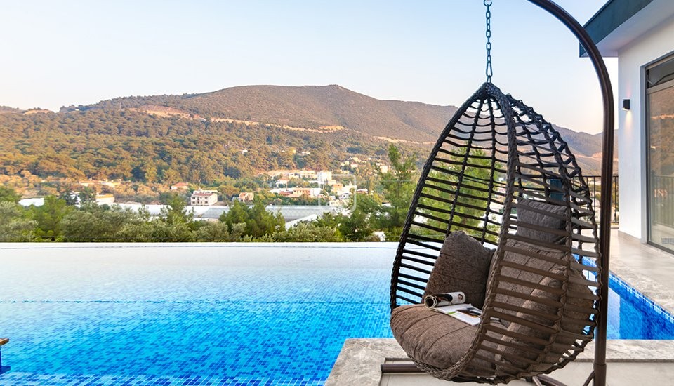 Outside the villa is an infinity pool which looks out over the countryside. The pool can be made sheltered with the use of a curtain system, if required. This villa is in a lovely working Turkish village, and it has views out over the surrounding countryside, with Kalkan only a 15 minute drive.